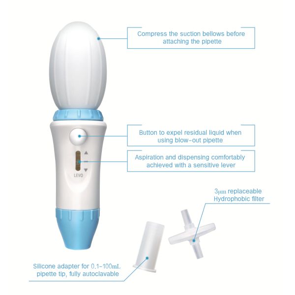 Ease of use, Precise pipetting control, Robust and light weight, Compatible with most of the plastic and glass pipettes from 0.1 -100mL, 3μm replaceable hydrophobic filter, Easy cleaning and maintenance